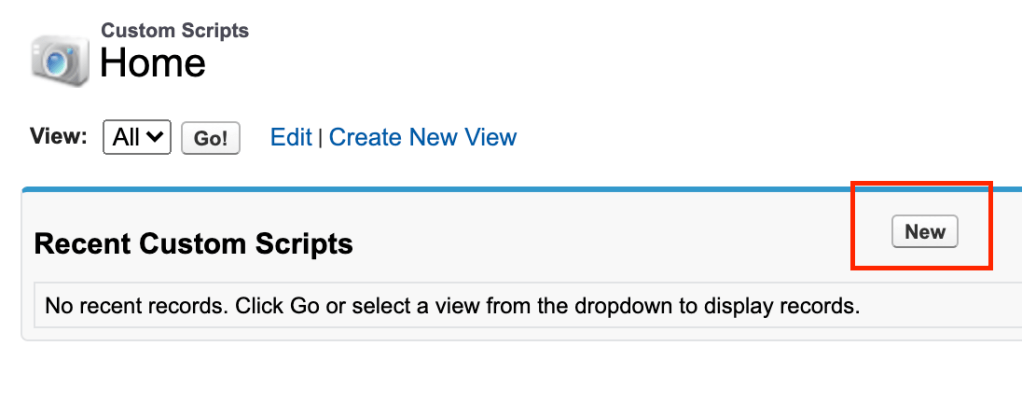 1. Navigate to the “Custom Scripts” Object. This object comes natively with CPQ and can be used to store QCP scripts.